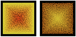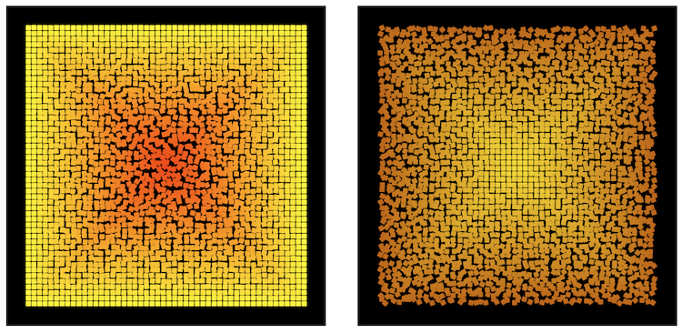 Was sehen wir? Die Grundstruktur bei Boxes ist ein regelmäßiges Gitter aus quadratischen Kacheln (darin besteht die Nähe zur Ausgangslage bei Schotter). Im Fall von Boxes I nehmen die zufälligen Drehungen und die Verschiebungen aber zu, je näher die einzelnen Quadrate am Zentrum des Gitters liegen. Im Fall von Boxes II dagegen nehmen sie zu, je weiter die einzelnen Quadrate vom Zentrum des Gitters entfernt sind. Das Zeichnen der Quadrate wird dabei rekursiv solange fortgesetzt, bis die Auswertung des Abstands vom Zentrum ein vorgegebenes Abbruchkriterium überschreitet.