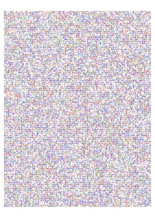 So arbeitet das Programm: Für das Recoding eines seiner Vorbilder wird für jedes Feld in der Matrix bestimmt, wieviel Linien (1<n<4) in welcher Farbe (hier z.B. rot, grün oder blau) gezeichnet werden.
