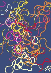 Was sehen wir? Gekrümmte Linien entstehen nach Kandinsky durch abwechselnde Kräfte, die auf einen wandernden Punkt einwirken. Im Bild Kraftlinien wird dies dadurch erreicht, dass sich kurze gerade Stücke (ohne Krafteinwirkung) mit gebogenen Abschnitten abwechseln, bei denen der Punkt auf einen Kreisbogen gezogen wird. Entsprechend werden im Programm für eine wählbare Zahl von Punkten, die eine bestimmte Anzahl von Schritten vollziehen, gerade und gebogene Teilstücke aneinander gesetzt. Die Bildstruktur kann durch variable Liniendicke und Farben, sowie die Länge der geraden Abschnitte und der Krümmung der gebogenen Abschnitte beeinflusst werden.