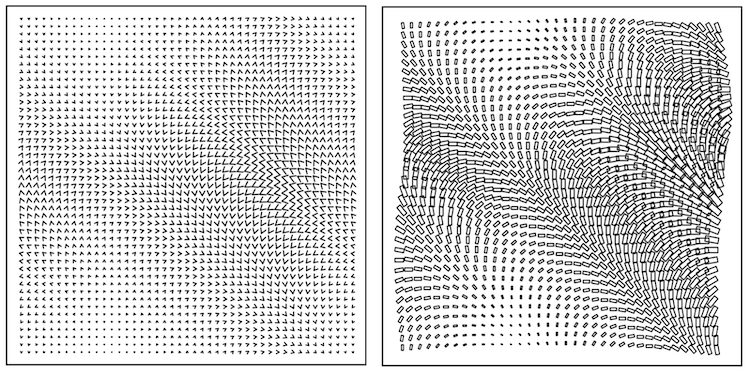 Komuras Arbeit mit dem Titel Optical Effect of Inequality nutzt das mathematische Symbol > (größer als) zur Erzeugung eines grafischen Musters. Das Recoding führt zu dem Bild links, das weitgehend dem Vorbild entspricht (im Original Weiß auf Schwarz).