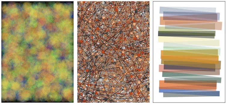 So arbeitet das Programm Flächenstapel: Neben der Breite des Bildrands kann im Programm auch die Grundfarbe der Linien festgelegt werden. Mit der Festlegung des Bereichs des gelenkten Zufalls für die Richtung der einzelnen Linien sowie der Liniendicke (wann sie dadurch also zur Fläche wird) kann der Bildeindruck deutlich verändert werden.